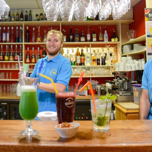 Côté bar et restaurant, son équipe vous accueillent sur la terrasse ombragée pour un café, une glace, un repas en famille ou une soirée conviviale.