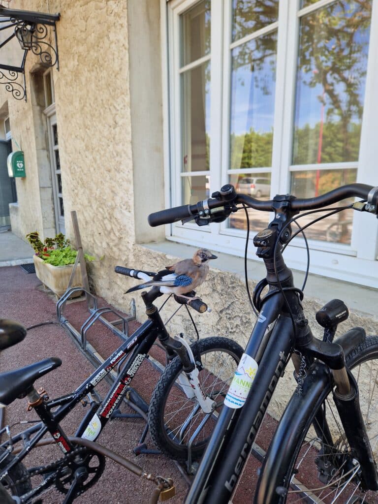 Il arrive qu’un geai curieux passe faire sa tournée matinale : on l’a déjà vu se poser sur les chaises des campeurs, sur les selles des vélos de location, comme s’il inspectait le camping avant tout le monde.