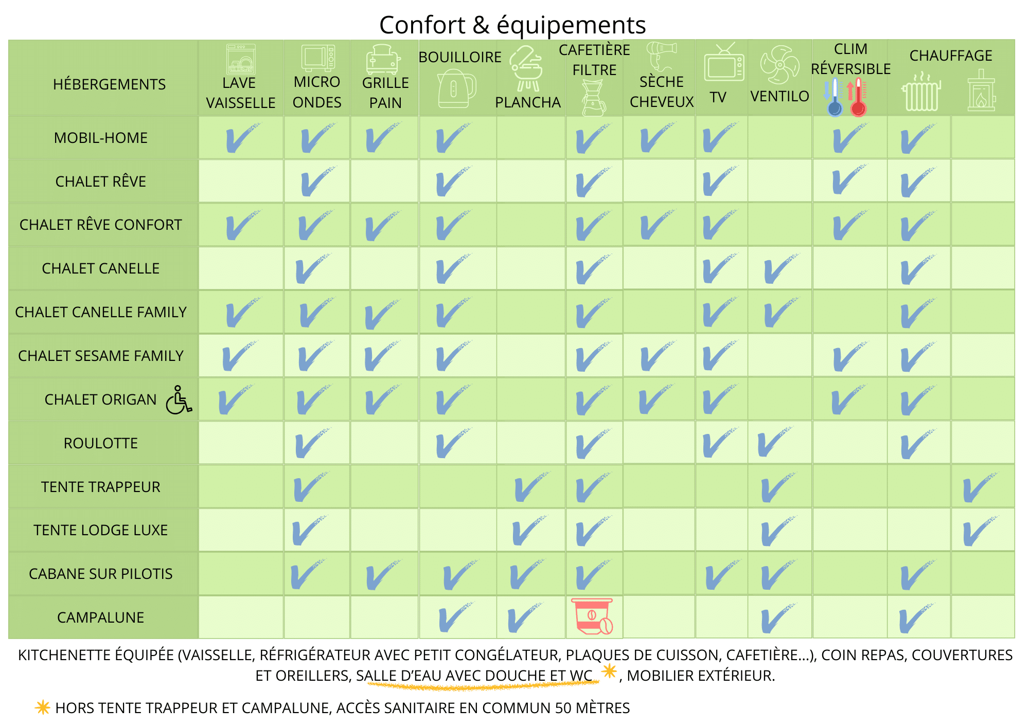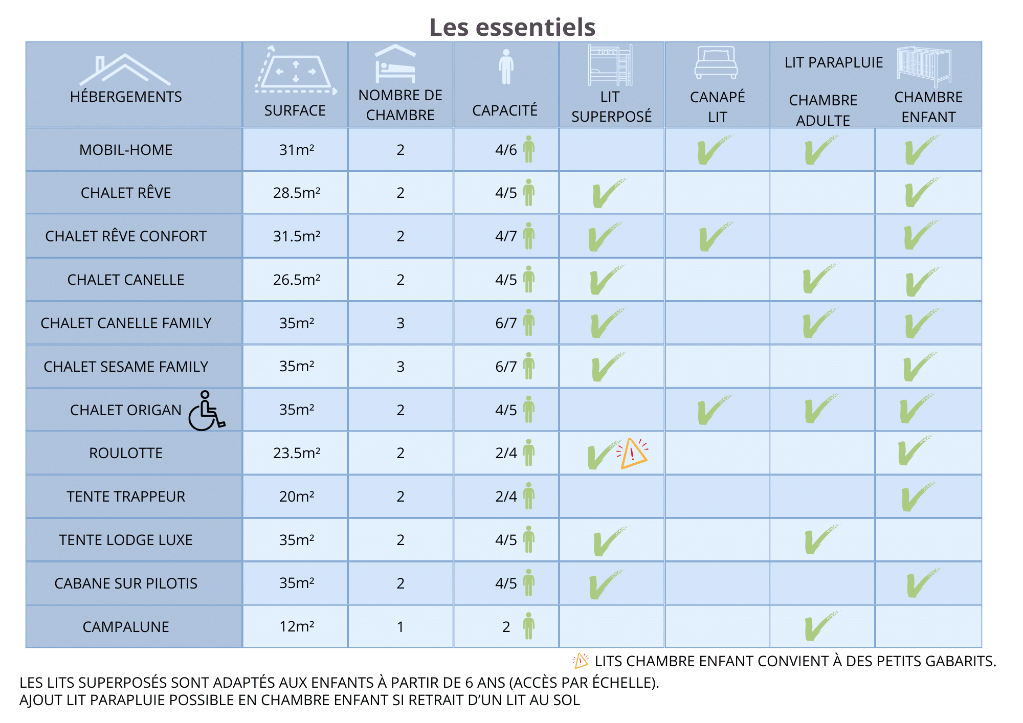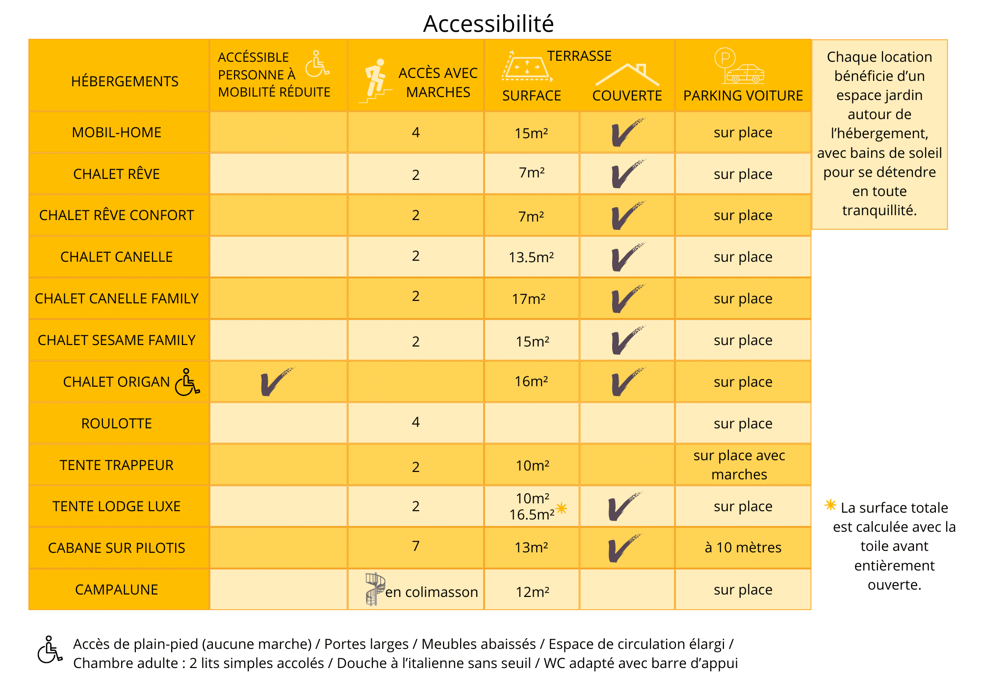 Pour vous aider à comparer nos hébergements en un clin d’œil, retrouvez ci-dessous les informations essentielles, le niveau de confort et les détails d’accessibilité de chaque location