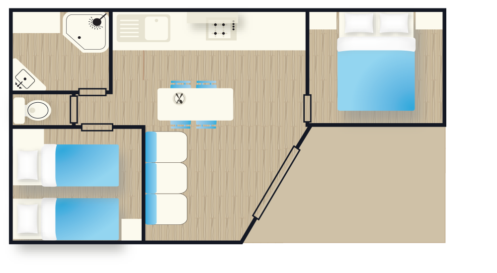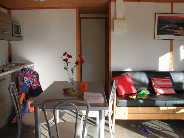 La grande baie vitrée du salon s’ouvre sur une terrasse spacieuse, vous permettant de fusionner les espaces intérieurs et extérieurs pour des moments de détente ou des repas al fresco. Cette terrasse est l’endroit parfait pour profiter de la vue sur le camping tout en bénéficiant de l’ombre et du confort.