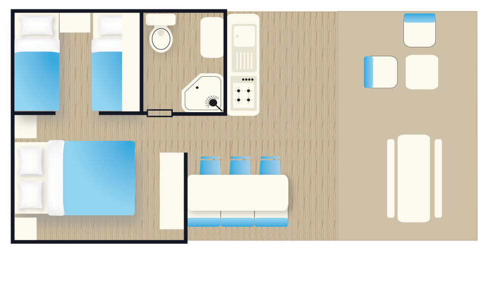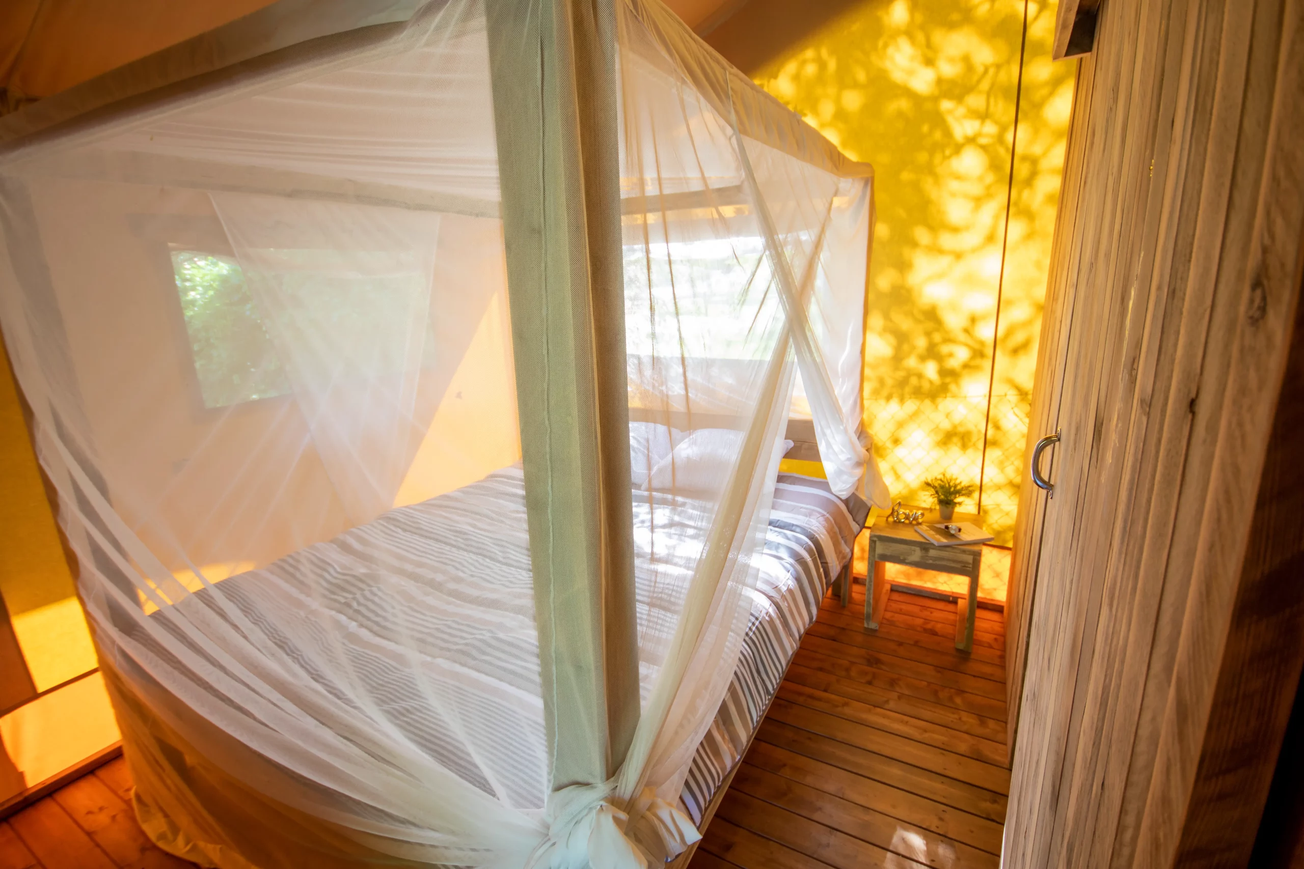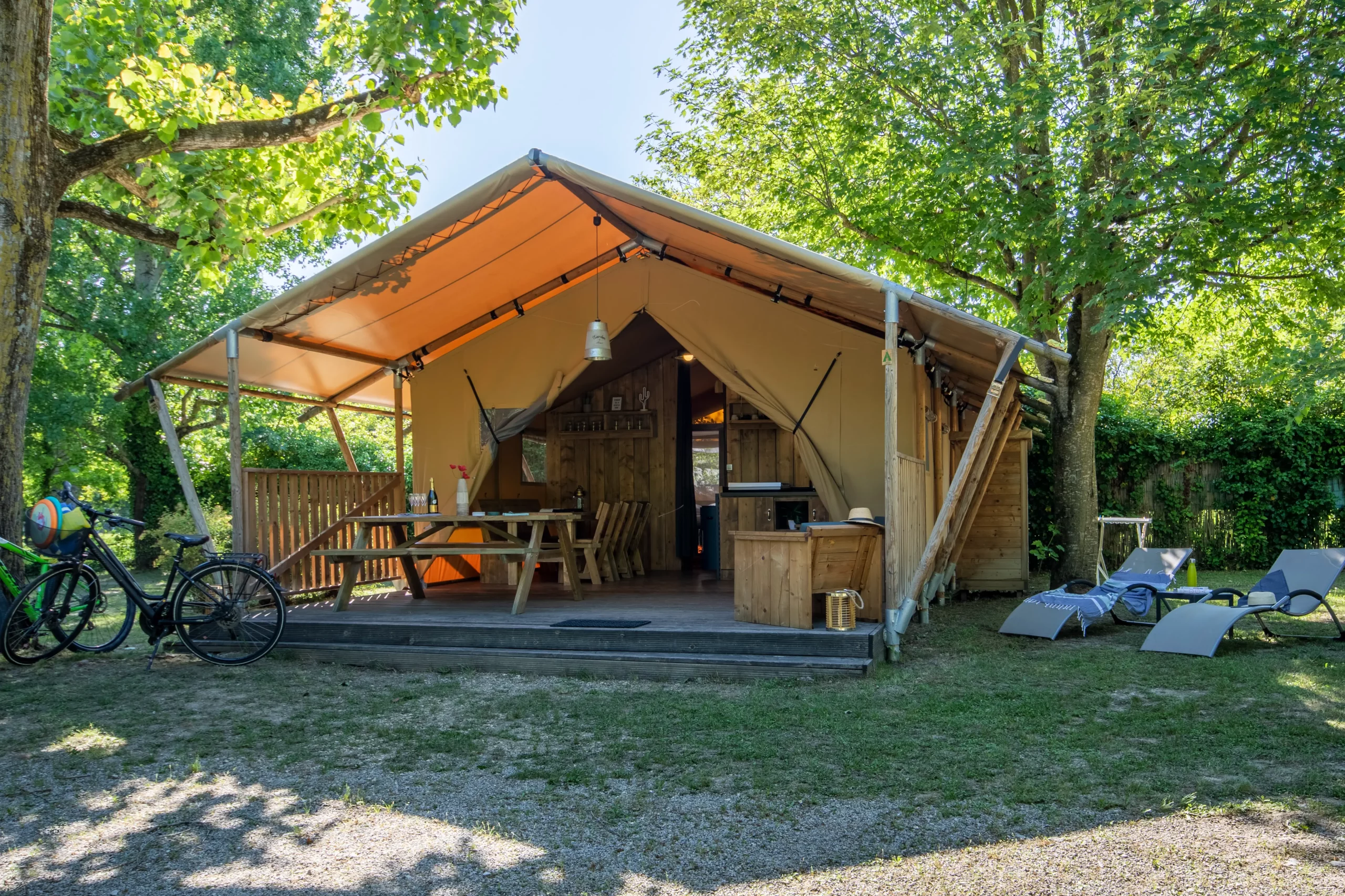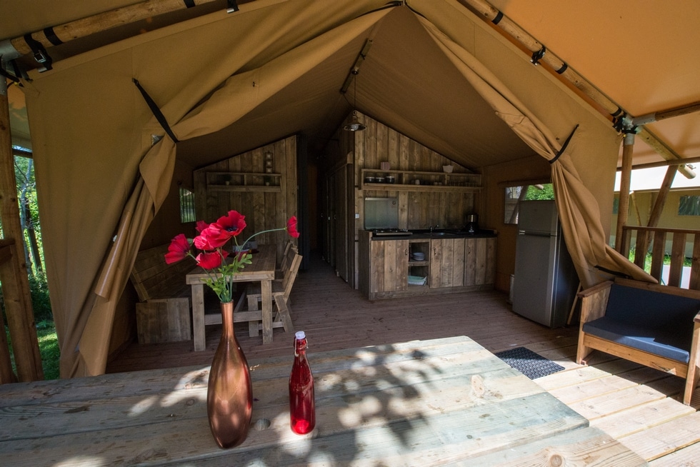 Tendance confort, douillet et chic, cette grande tente offre un intérieur cosy et soigné avec son mobilier en bois brut, ses sanitaires et une vaste terrasse couverte. Une belle expérience de camping glamour, à deux ou en famille. Les enfants adorent la chambre avec des lits superposés.