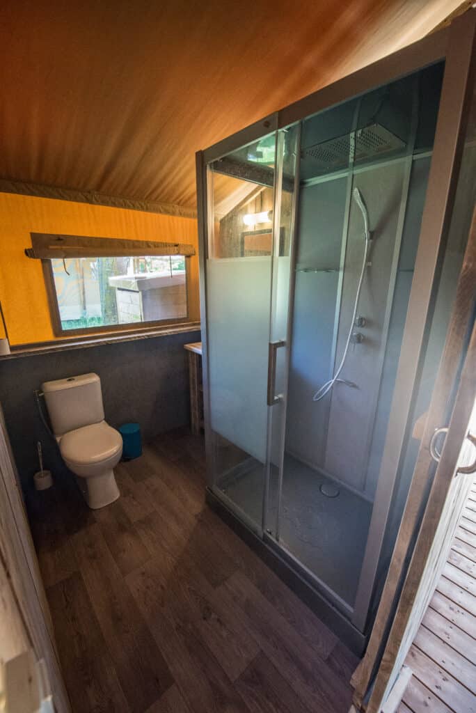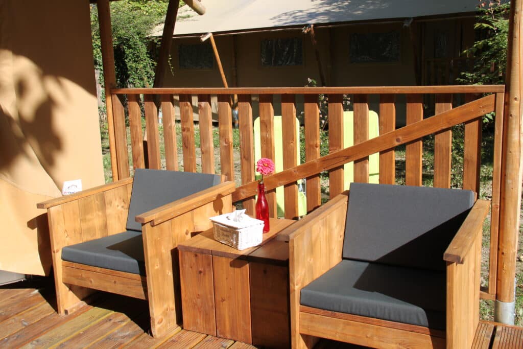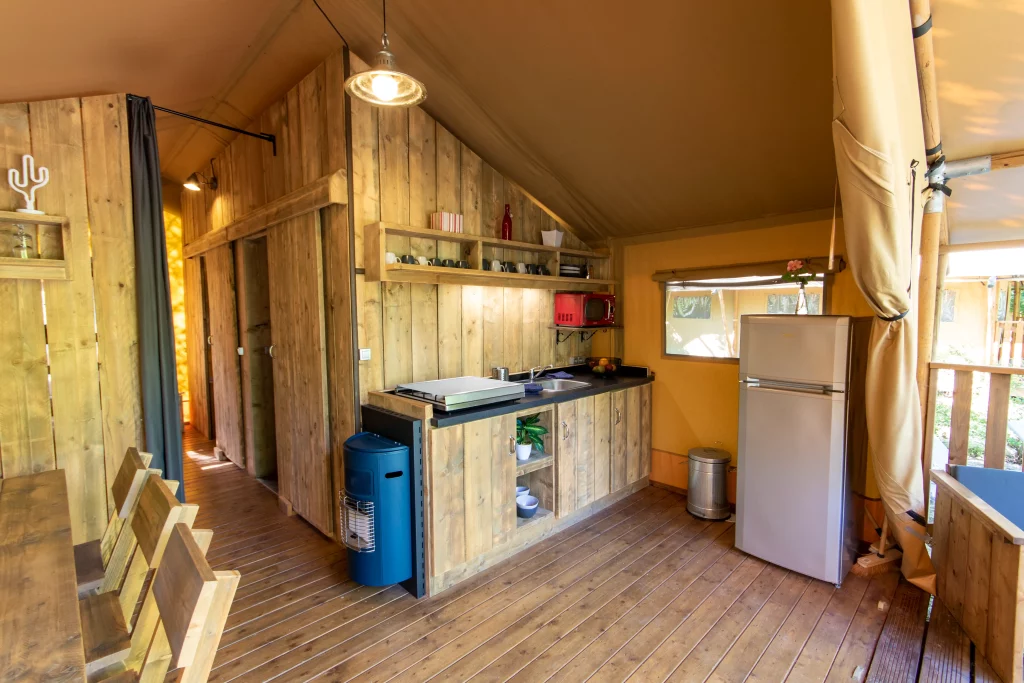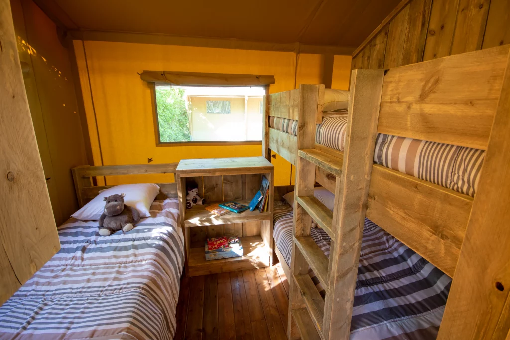 Tendance confort, douillet et chic, cette grande tente offre un intérieur cosy et soigné avec son mobilier en bois brut, ses sanitaires et une vaste terrasse couverte. Une belle expérience de camping glamour, à deux ou en famille. Les enfants adorent la chambre avec des lits superposés.