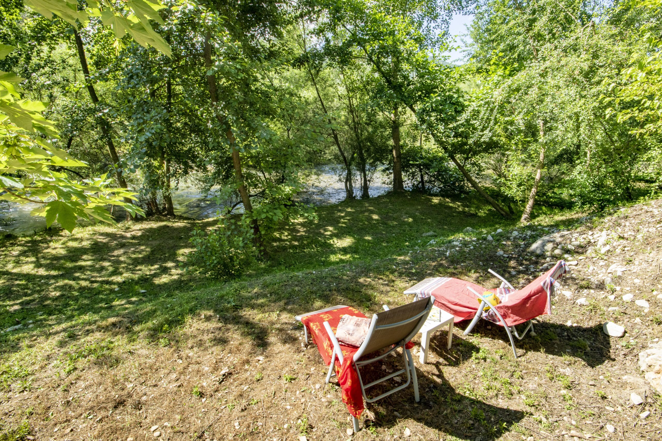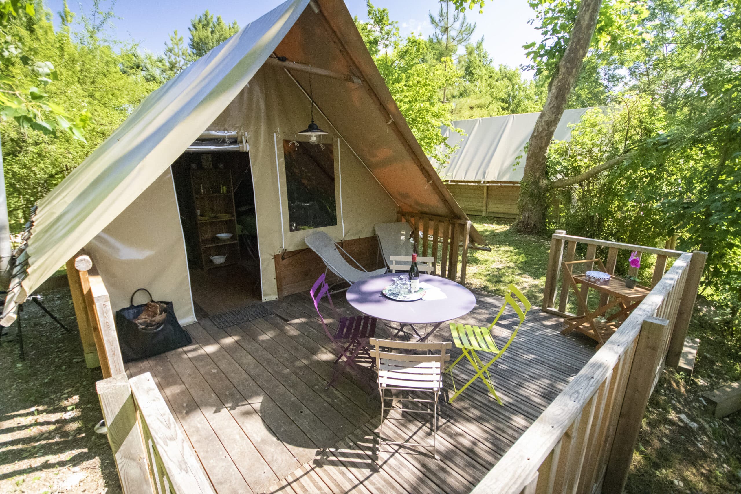 Une tente avec plancher en bois, terrasse avec salon de jardin surplombant la rivière, pour vivre une expérience intime avec la nature et même se prendre pour un trappeur…