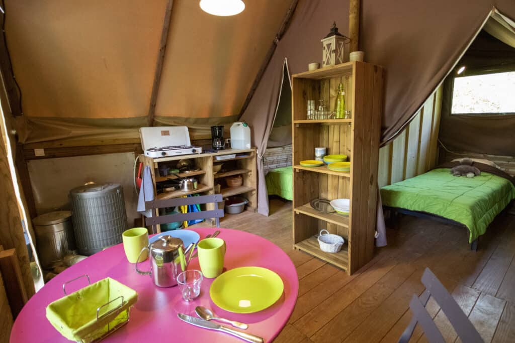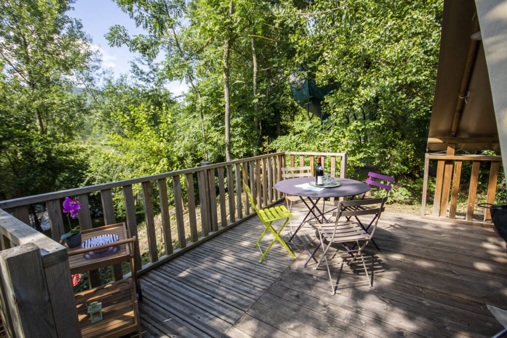 Une tente avec plancher en bois, terrasse avec salon de jardin surplombant la rivière, pour vivre une expérience intime avec la nature et même se prendre pour un trappeur…